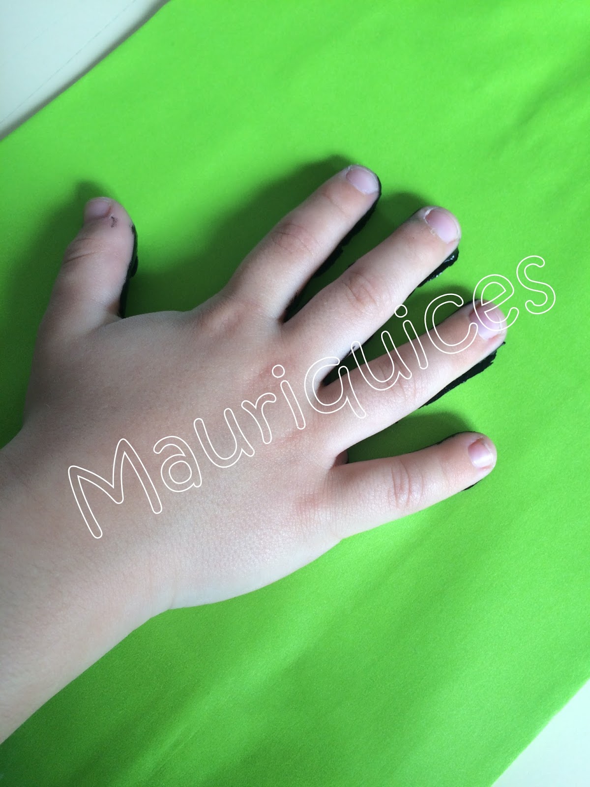 Num saco de papel verde estampámos a palma da mão pintada com tinta cenográfica preta. Para a lã da ovelha utilizámos quadrados de algodão que enrolámos e cortámos em fatias finas para fazer o efeito de rolinhos. Colámos um olho de mexer e fizemos o focinho, a boca e as unhas com corretor. Com EVA verde fizemos a relva.
