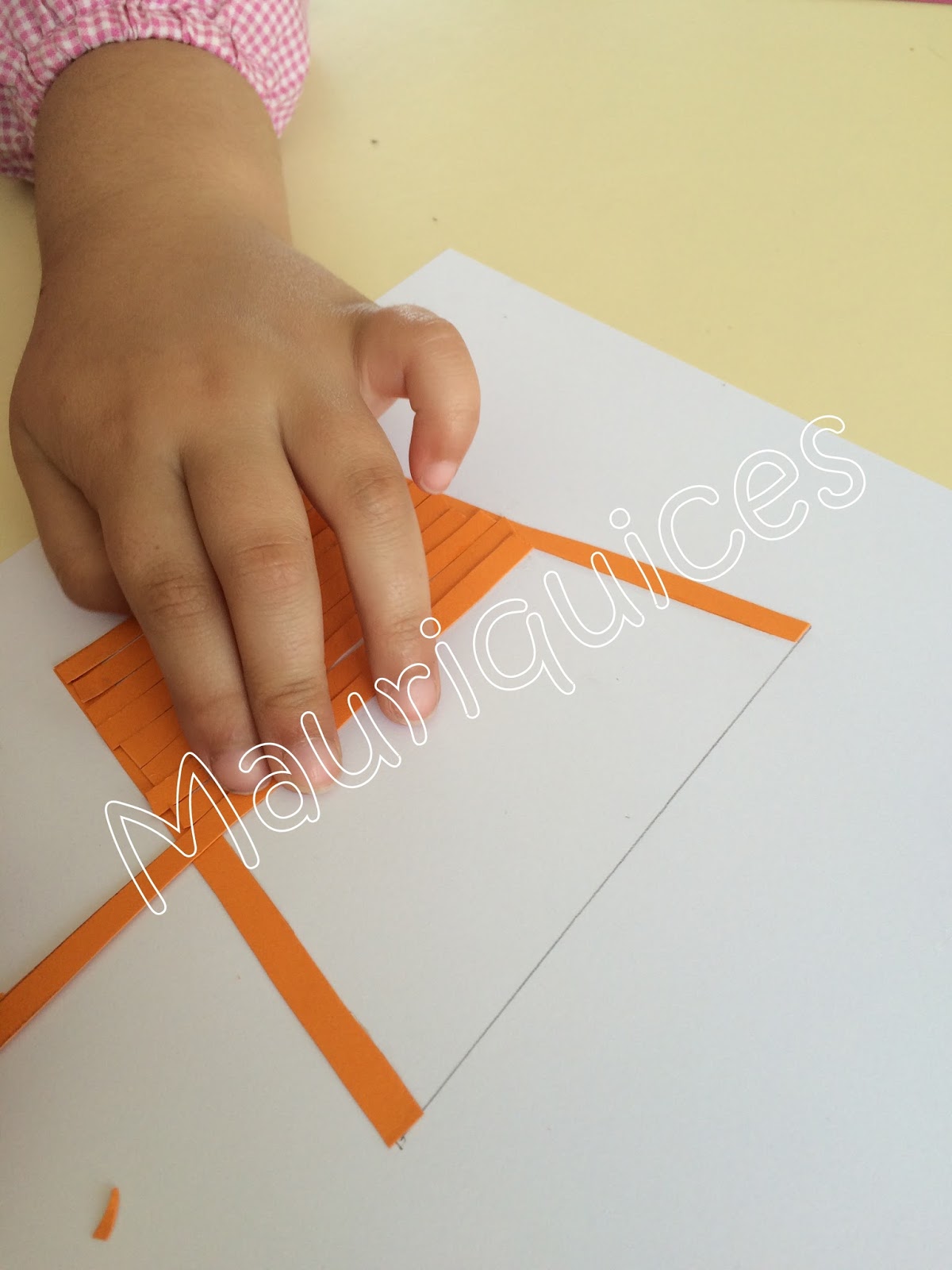 Em cartolina cor de laranja recortámos várias tirinhas. Numa folha de papel de branco desenhámos o contorno do vaso de um manjerico que cobrimos e preenchemos com as tirinhas. Na parte superior do majerico colámos muitas penas verdes.