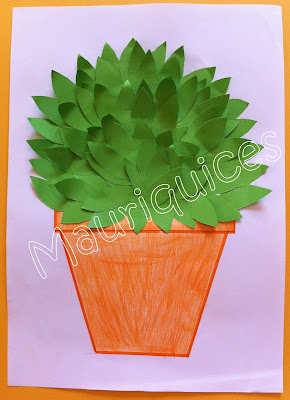 Em folhas A4 verdes recortámos muitas folhinhas que colámos para criar o manjerico.