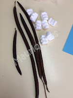 Apanhámos vagens da árvore que estava no nosso jardim. Colámo-las numa cartolina azul para criar o tronco e os ramos de uma árvore. À volta desta colámos pedacinhos de esferovite branco que vinham numa caixa a embalar um eletrodoméstico. Assim, criámos uma árvore coberta de neve.