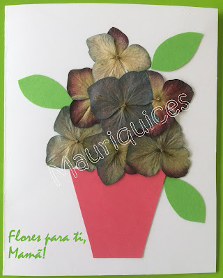 Para a base utilizámos cartolina branca. Em cartolina cor de rosa fizemos o vaso, em cartolina verde as folhas e colámos flores de hortênsia secas para completar o postal.