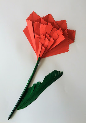 Utilizámos quadrados de papel vermelho de vários tamanhos que foram recortados com uma tesoura de zig-zag. Dobrámos os quadrados como está na primeira imagem e colámo-los para formar as pétalas do cravo. Para o pé utilizámos uma pena verde.