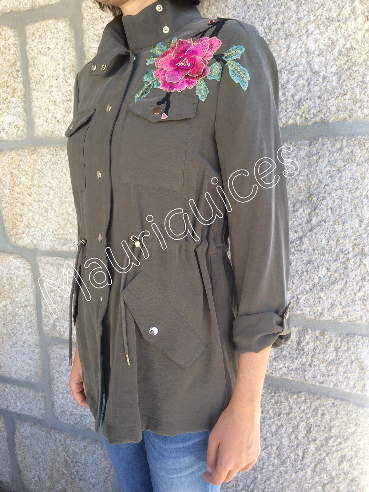 Comprei um casaco verde caqui básico. Para o personalizar apliquei-lhe uma ramagem florida em tons rosa e verde. Aqui está o resultado... agora é exemplar único.