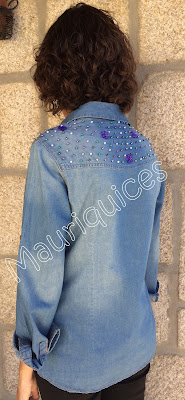 Numa camisa de ganga lisa cosi contas em tons de lilás, azul e pérola para dar um toque mais pessoal à peça.