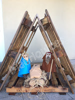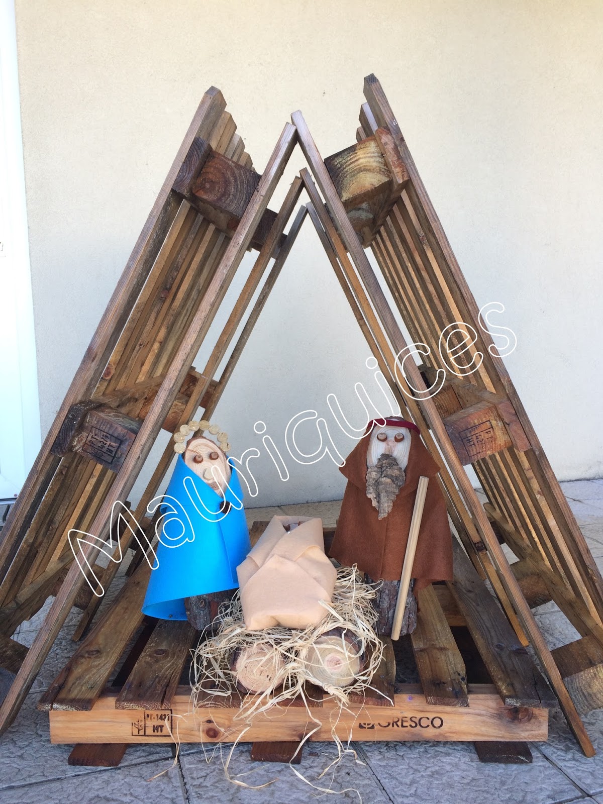 Para fazer a cabana utilizei três paletes de madeira e toros de árvore para fazer as figuras. Para cada uma das vestes utilizei uma folha inteira de feltro. Nas caras colei duas avelãs para representar os olhos, um pedaço de cortiça para o nariz e boca. Fiz as barbas de S. José com casca de pinheiro. No manto de Maria colei um botão feito com uma mini-pinha e coloquei na sua cabeça uma aura feita com rodelas cortadas de uma rolha de cortiça, que enfiei num arame e pintei de dourado. No cimo da cabana coloquei uma estrela feita em cartolina dourada e no centro desta colei pinhas que pintei de dourado. Por cima das paletes coloquei hera e medronheiro.