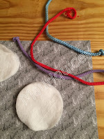 Para a base utilizámos uma folha de cartolina de fantasia e nela colámos 3 bonecos de neve feitos com rodelas de algodão para desmaquilhar. Atámos cordel que aproveitámos das asas de sacos de papel à volta da rodela para criar um cachecol e assim formar a cabeça e o corpo do boneco de neve. Na cabeça de cada um colámos dois olhinhos de mexer, um nariz feito de limpa cachimbo cor de laranja e forminhas de papel de várias cores para representar o chapéu. Para representar a neve colámos mini pompons brancos.