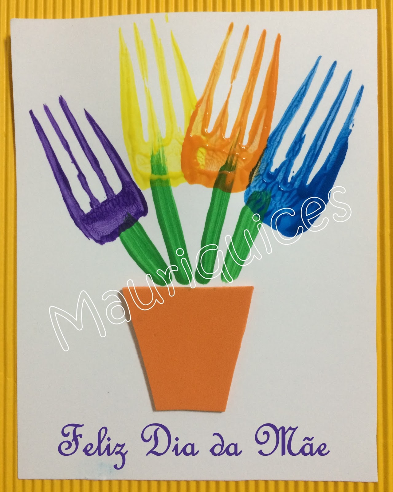 Para base utilizámos cartolina branca e nela colámos um vaso feito de EVA cor de laranja. Com um pincel e tinta cenográfica verde pintámos os pés das flores. Com um garfo e tinta de várias cores estampámos as flores.