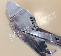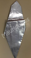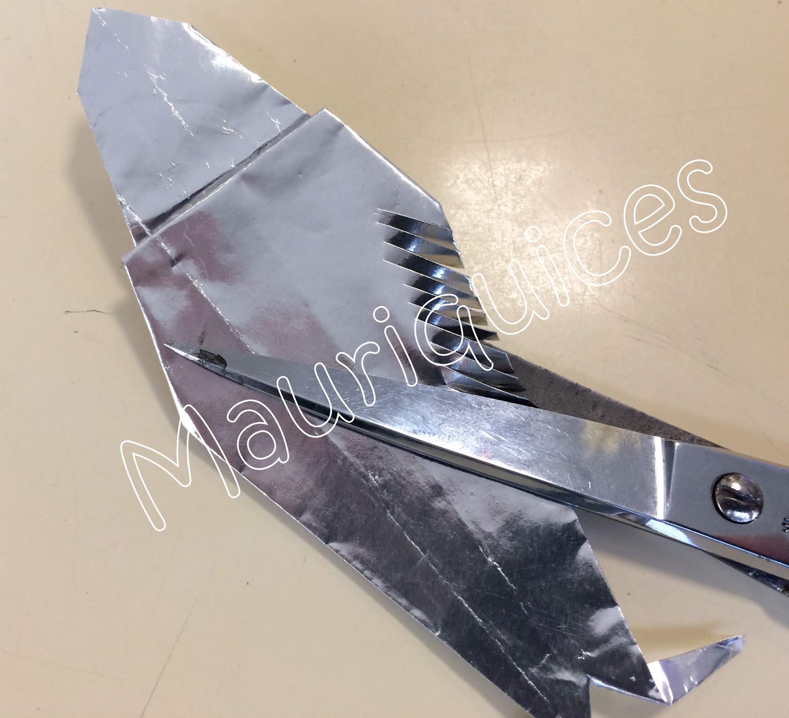 Com tinta cenográfica azul e um frasco com esponja na ponta estampámos com força vários pingos para representar o mar. Com papel prateado fizemos a dobragem representada nas fotografias de forma a criar sardinhas. Fizemos sardinhas de vários tamanhos e colámos na folha de papel. Rematámos com um olhinho de mexer em cada sardinha.