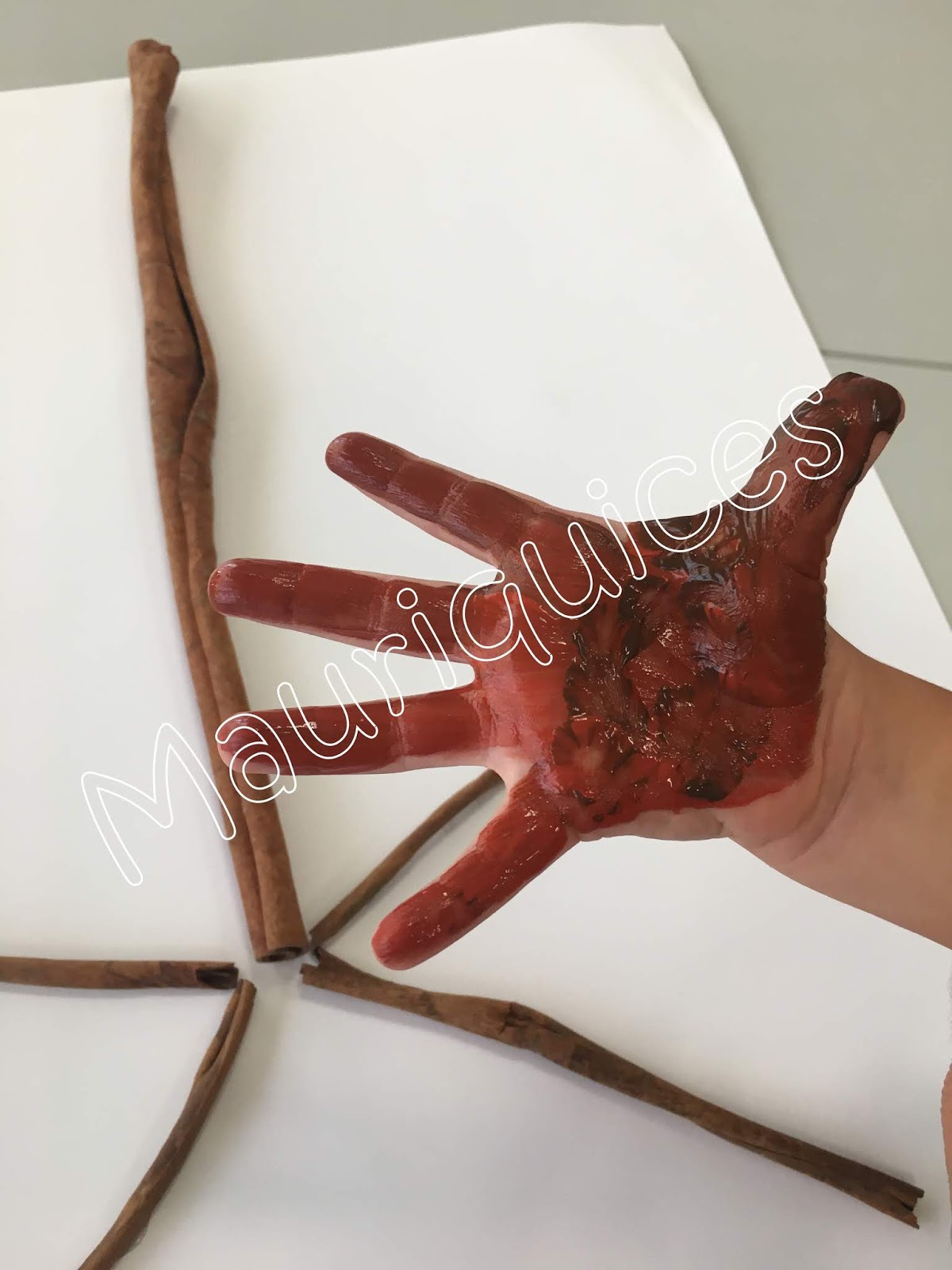 Com tinta cenográfica verde pintámos a palma da mão que estampámos várias vezes numa tela, de forma a criar um pinheiro. Posteriormente colámos uma estrela recortada em EVA dourada brilhante no topo da árvore. Com um pau de canela fizemos o tronco. Rematámos colando pompons coloridos para simular as bolas da Árvore de Natal. Assim fizemos uma recordação para perdurar.