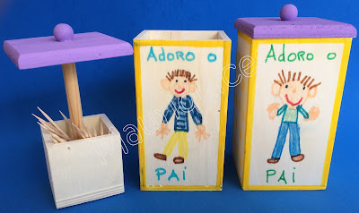 Para oferecer um presente no Dia do Pai comprámos paliteiros em madeira. Cada um de nós pintou a tampa com tinta de madeira lilás. Na parte da frente desenhámos o pai com marcadores. Nas partes laterais fizemos pintinhas com um cotonete molhado em tinta amarela. No final fizemos uma esquadria amarela em todas as faces do paliteiro e escrevemos "Adoro o Pai".