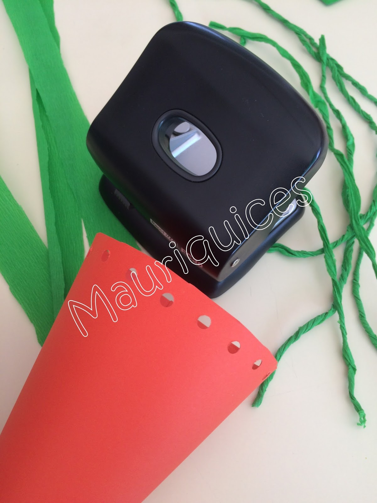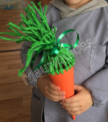 Para colocar os ovinhos de chocolate que o coelhinho de Páscoa vai trazer fizemos esta caixa em forma de cenoura. Em cartolina cor de laranja fizemos um cone. Na parte superior do mesmo, fizemos vários furos com um furador. Em cada um dos furos prendemos tiras de papel crepe verde enroladas, formando assim a rama da cenoura. Rematámos com um laço feito com uma fita de presente.