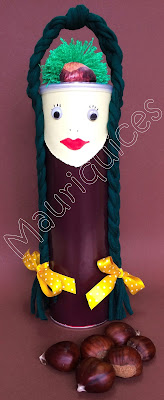 Revestimos uma caixa de Pringles com papel de lustro castanho. Recortámos em papel bege a cara, onde colámos dois olhinhos de mexer e desenhámos uma boca, o nariz e as pestanas. Em trapilho verde fizemos umas tranças que também servem de alça, nas suas extremidades colocámos dois lacinhos amarelos. Na tampa colámos um pompom verde e a imagem de uma castanha para representar um ouriço.