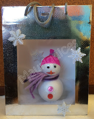 Elaborámos este trabalho utilizando um saco de papel prateado. Numa das suas partes laterais recortámos um quadrado que revestimos com uma folha de acetato de forma a criar uma janela. No fundo do saco colámos espuma de exaustor de modo a criar a neve. Com duas bolas de esferovite fizemos o boneco de neve que completámos com dois botões, um cachecol de lã, um gorro de papel crepe, dois olhinhos de mexer, um nariz feito com um bico de lápis de cor e uma boca de cartolina vermelha. Colámos ainda cristais de gelo para completar o trabalho.