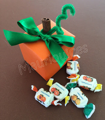 Coloquei rebuçados numa caixa quadrada que depois embrulhei em papel cor de laranja. Colei um pau de canela para representar o pé da abóbora, enrolei nele um limpa-cachimbo verde e um laço de cetim verde.