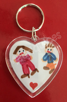 Comprámos um porta-chaves em acrílico em forma de coração que abre de forma a colocar dentro uma fotografia ou um pedaço de papel. Optámos por recortar uma folha de papel branca em forma de coração, de um lado desenhámos o pai connosco e do outro lado, com tinta cenográfica vermelha, estampámos o nosso indicador por três vezes, de forma a criar o coração.